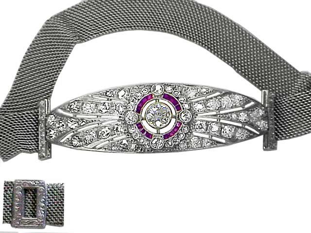 Platinum Diamond Calibrated Ruby Edwardian Bracelet With 14k W Mesh Band ca1910