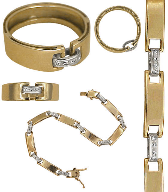 14k Yellow and White Gold and Diamond Deco Style Bracelet and Ring Set, ca1940s